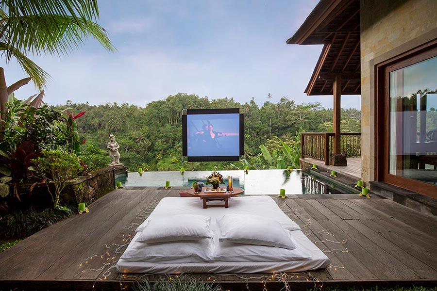 Experience the epitome of luxury and romance with our exclusive in-villa “Movie Under the Stars” at The Kayon Jungle Resort. Picture yourself nestled in the comfort of your private villa, surrounded by the enchanting sights and sounds of the jungle, as the night sky comes alive with twinkling stars.