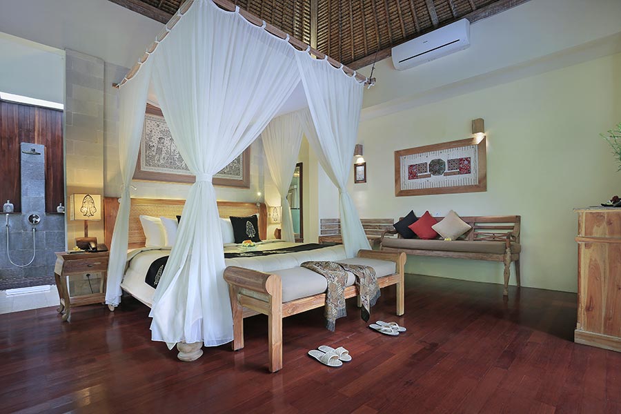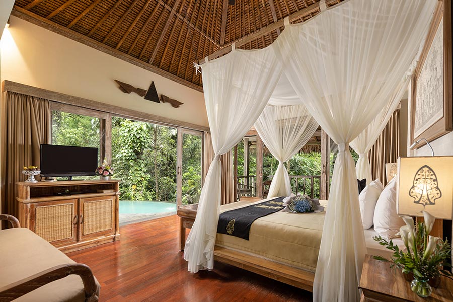 Cradled by tropical greenery, the Kayon Garden Suite is a serene hideaway where timeless Balinese charm meets refined simplicity. A soft glow fills the room through wide windows, illuminating natural textures, the gentle elegance of a bed draped in a billowing mosquito net.