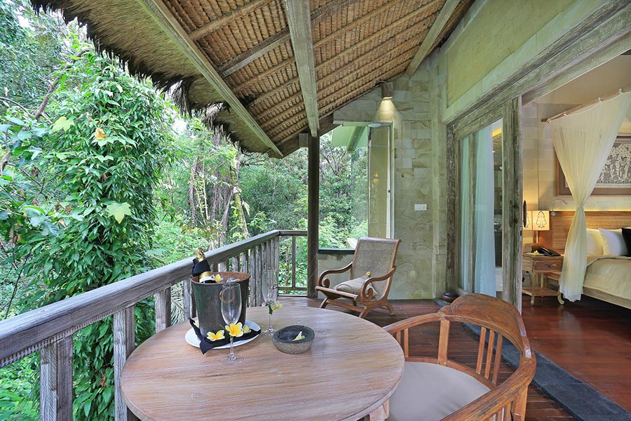 Our Pool Villas are designed in contemporary Balinese style using local stone, bamboo, white washed furniture decorated with woven rattan to blend with nature and create classic yet romantic impression. Featuring bamboo ceiling, comfortable bed with soft cotton linens and mosquito net, classic Balinese Kamasan Ramayana series painting and recycled arts work. Private balcony or terrace and spacious bath with shower and Kayon signature terrazzo bath tub overlook to jungles.