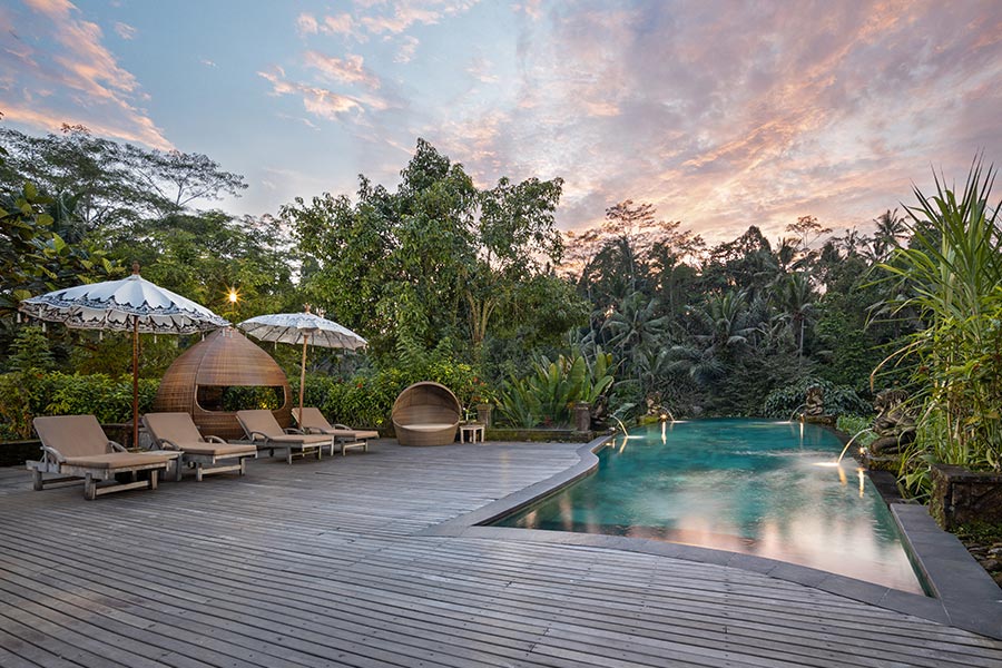 This stunning infinity pool lined with Batu Chandi stone, suspended in high over the surrounding river, appears to float in its setting. It’s a unique swimmer feeling for swimming above the treetops.